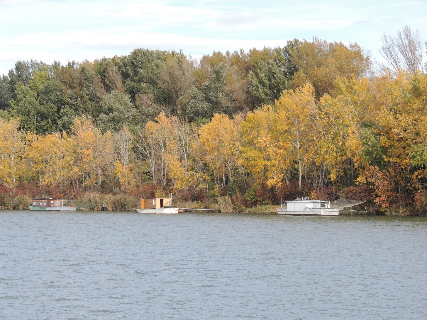 As we get closer to Vienna, the number of fishing cabins grows. We have been cruising through a national park all morning, surrounded by trees in various stages of Autumn glory. I’m not sure what type of trees they are, but some are tipped by white blooms. Others appear frosted, with silvery leaves shimmering in the sunlight.